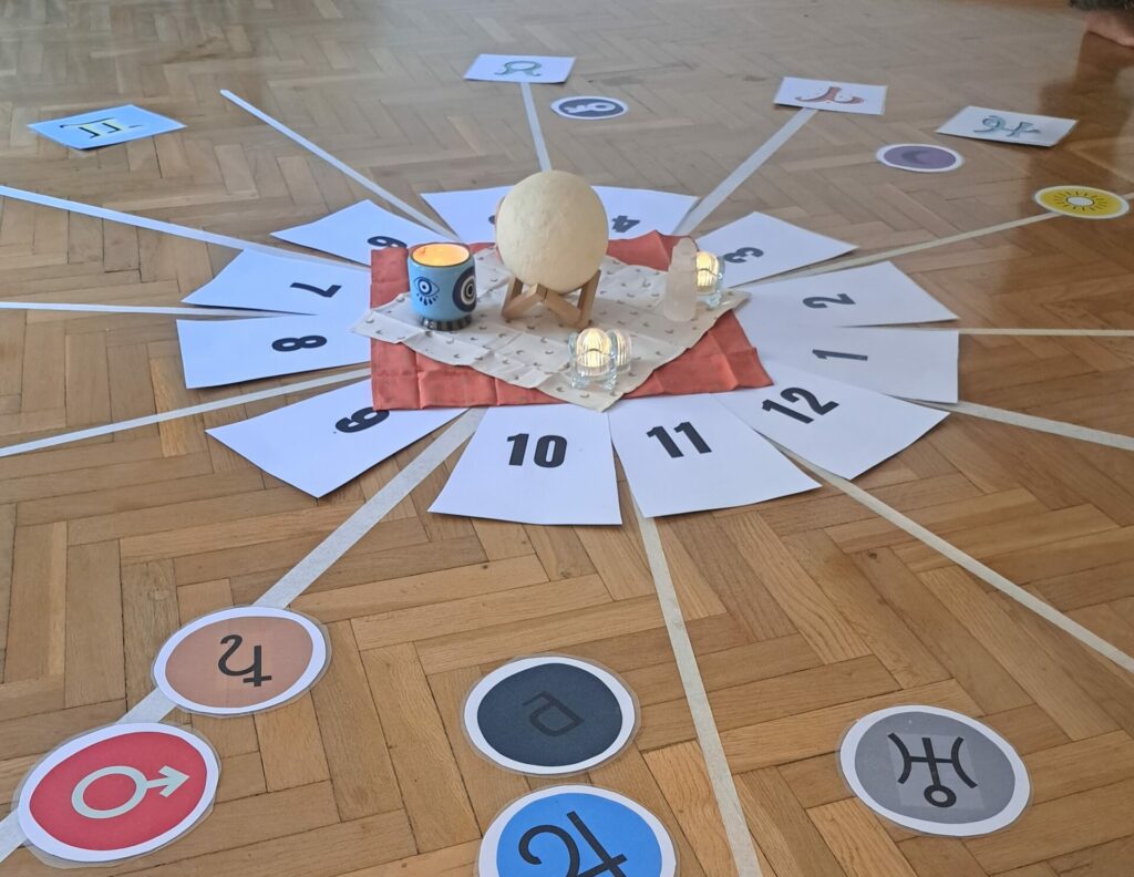 En lugar de interpretar la astrología solo de forma mental, proponemos habitarla: desplegamos tu carta sobre el espacio y te guiamos para que recorras cada zona, como un mapa de las áreas de tu vida. La astrología ofrece un mapa de las energías y recursos que tienes a tu disposición. Las constelaciones revelan cómo te vinculas con esas partes internas, con tus áreas vitales y con las personas que te rodean.